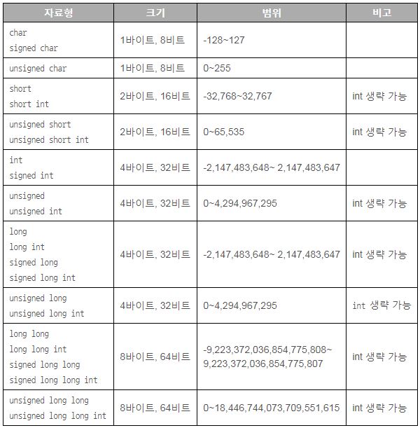 아래 표는 정수 자료형만을 나타낸 것이다.